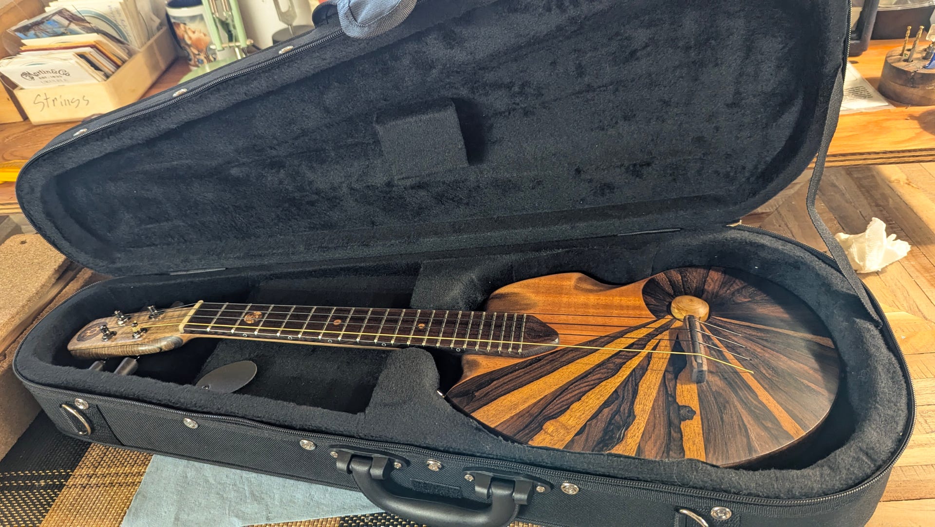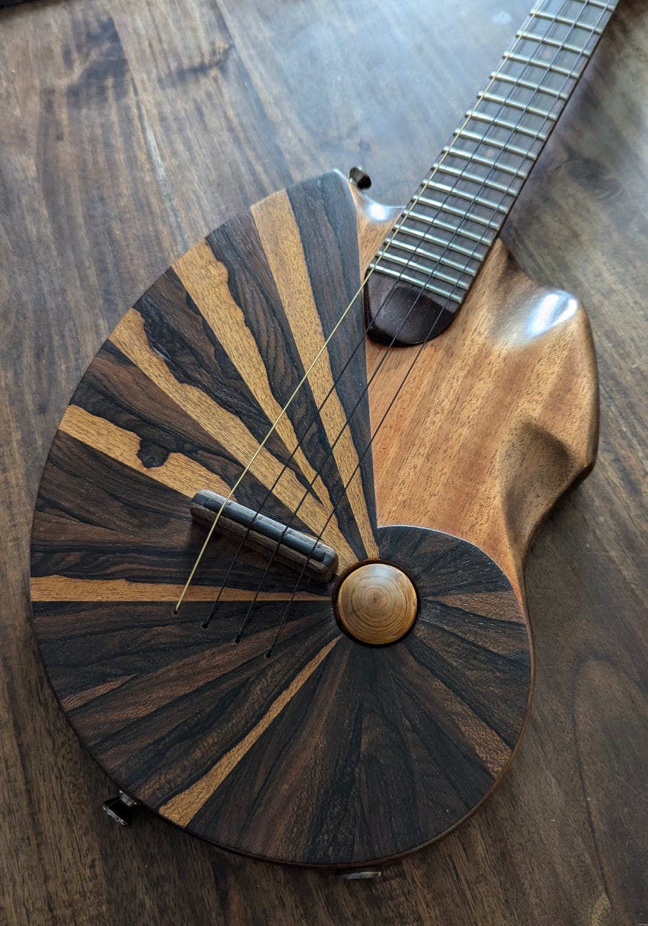 Ziricote Fibonacci Spiral. Solid body electric ukulele. Cedar crosscut branch volume knob.